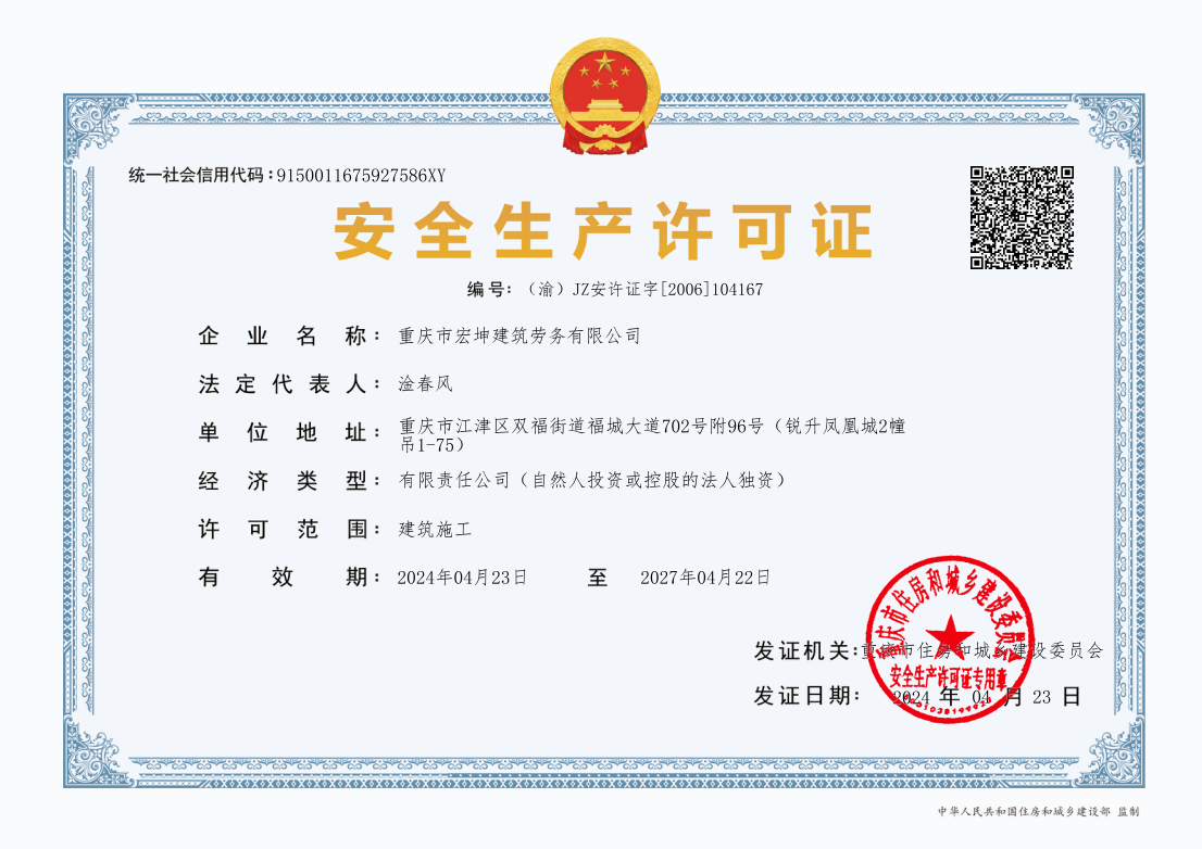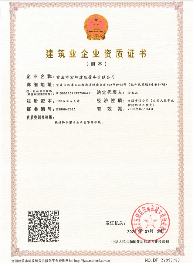重慶市宏坤建筑勞務有限公司專業從事砌筑、木制、抹灰、鋼筋、混凝土、腳手架、模板、焊接等建筑勞務作業,兼營建筑建材、建筑裝飾材料銷售。